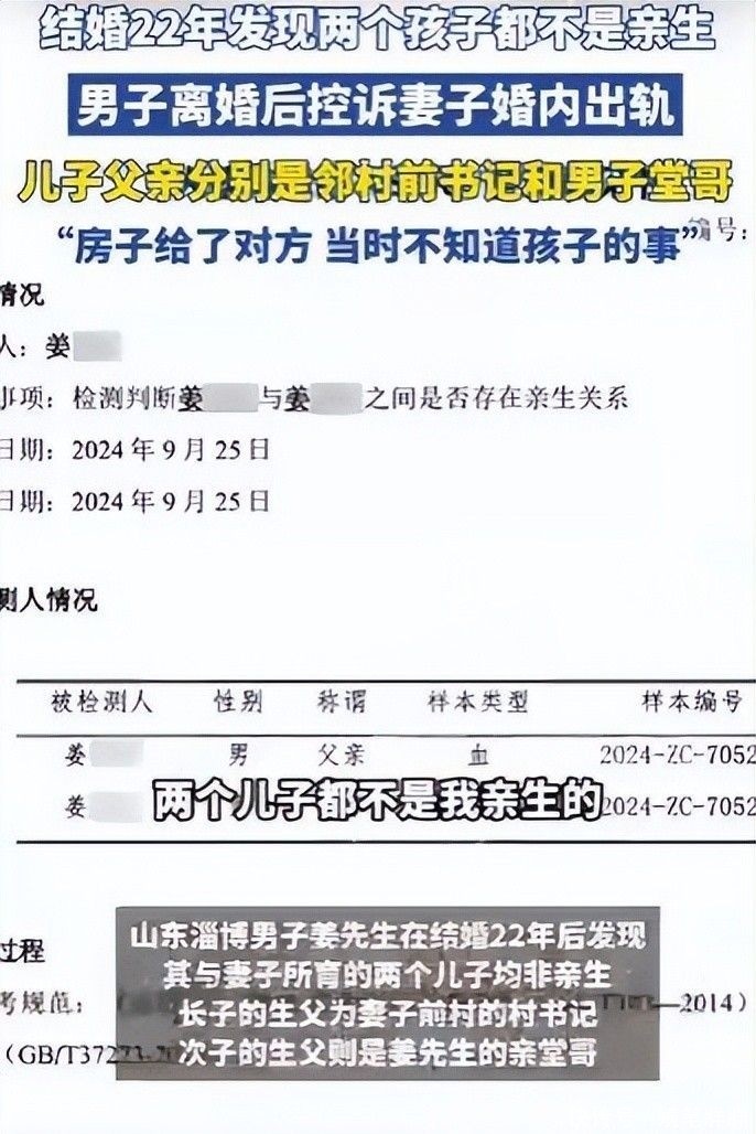 近日,山东淄博的姜洪涛事件引发全网热议。他与妻子携手走过22年婚姻,却在两个孩子成年后意外得知,他们并非自己亲生。大儿子是前妻与前任村书记所生,小儿子则是前妻与自己堂哥的孩子。姜先生倾尽半生心血养育的孩子,最终却成了与他毫无血缘关系的“仇人”。